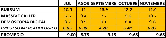 Por un lado, 11 encuestas del último mes, es decir el dato más reciente, 8 de ellas son de carácter nacional y 3 son empresas locales, que, para su pronta identificación, están subrayadas, en negritas y en cursivas en la siguiente tabla:
