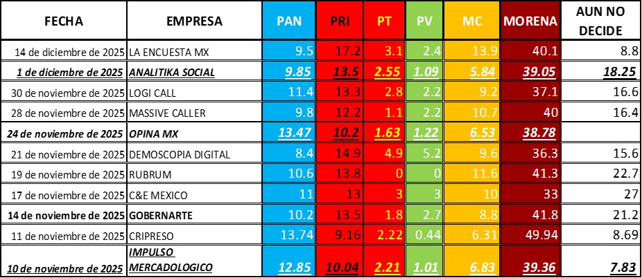 - Tendencia de Crecimiento Reciente: Su dato más alto aparece justo al final del periodo analizado (9% con La Encuesta MX el 14 de diciembre es la medición más optimista en el cierre de año.