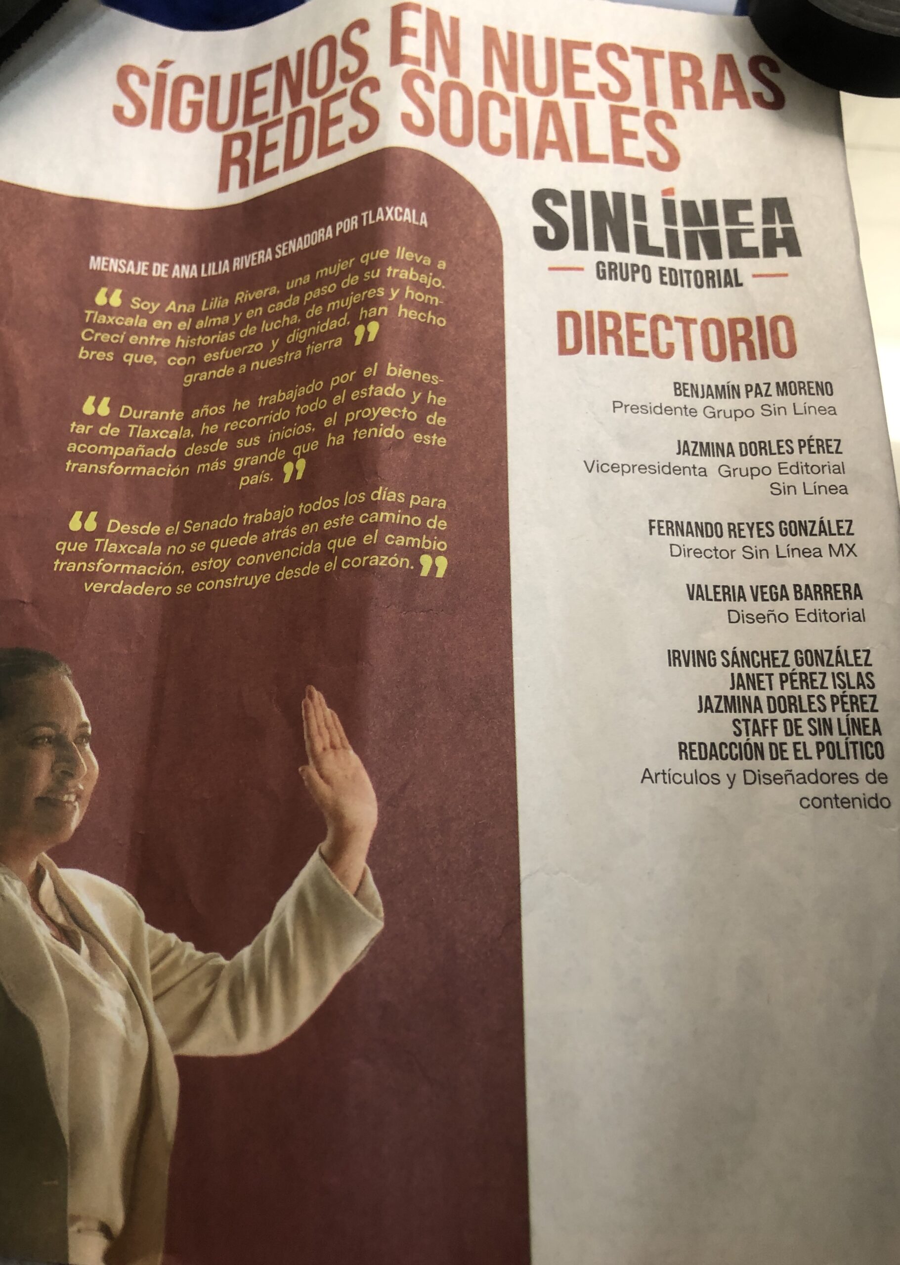 El grupo editorial “Sin línea”, que públicamente se identifica como un medio de información digital e independiente, está promoviendo la imagen de la senadora por Morena, Ana Lilia Rivera Rivera, a través de un semanario impreso de 15 páginas que ha sido distribuido en domicilios de la entidad.