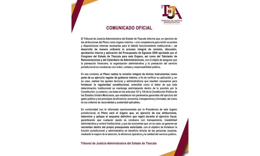 El Tribunal de Justicia Administrativa del Estado de Tlaxcala informa que, en ejercicio de las atribuciones del Pleno como órgano máximo —con competencia para emitir acuerdos y disposiciones internas necesarias para el debido funcionamiento institucional—, se desarrolla de manera ordinaria el proceso integral de revisión, discusión, aprobación interna y aplicación del Presupuesto de Egresos 2026 aprobado por el Congreso del Estado de Tlaxcala para este Organo, así como del Tabulador de Remuneraciones y del Calendario de Administraciones, con el objeto de asegurar que la planeación financiera, la organización administrativa y la prestación del servicio jurisdiccional se conduzcan con orden, certeza y responsabilidad pública.