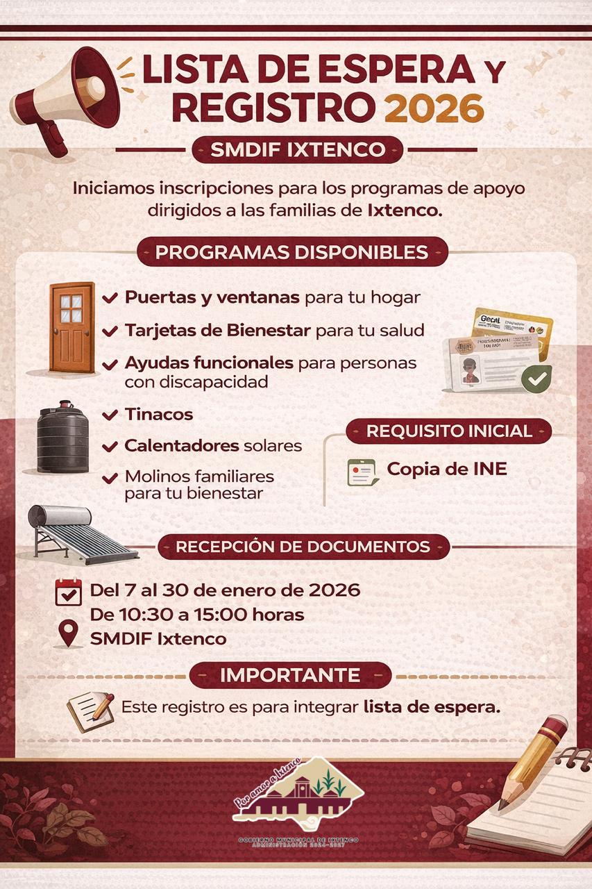 El Gobierno Municipal de Ixtenco, encabezado por la presidenta Aline Lazo Caballero, a través del Sistema Municipal DIF que preside Alicia Caballero Yonca, anunció la apertura del periodo de inscripción para integrar la Lista de Espera de los Programas de Apoyo 2026, dirigidos a las familias del municipio.