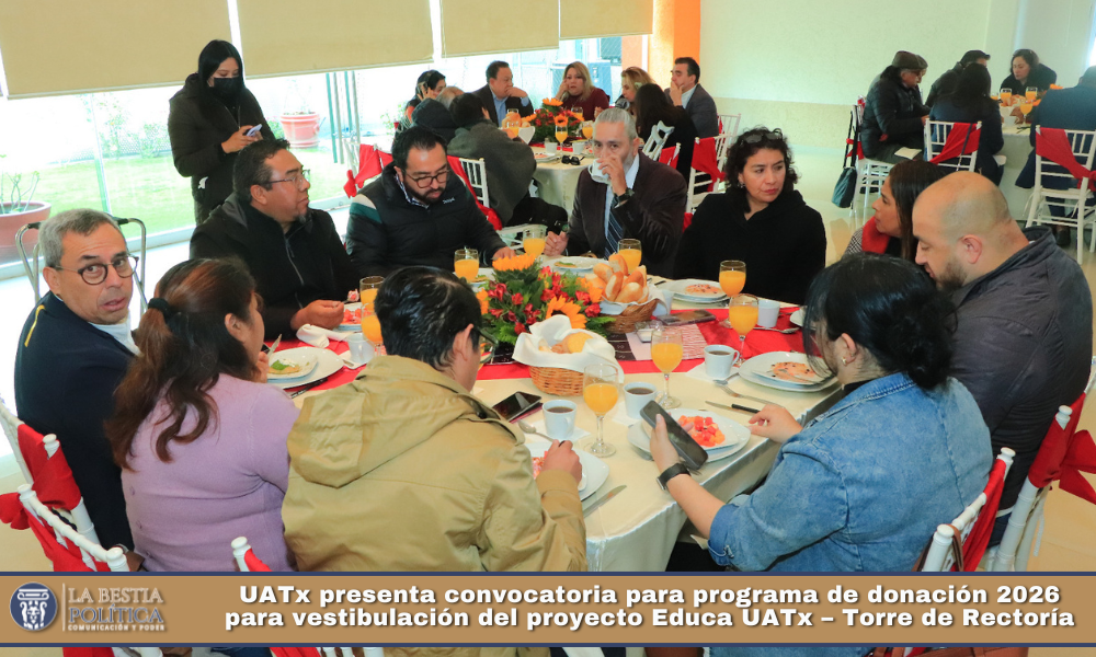El Doctor Serafín Ortiz Ortiz, Rector de la Universidad Autónoma de Tlaxcala (UATx), y el Maestro Dante Morales Cruz, Presidente de la Fundación Universidad Autónoma de Tlaxcala (FUAT A.C.), presentaron la convocatoria del programa de donación 2026 para la vestibulación de la Torre de Rectoría – Proyecto Educa UATx, durante un desayuno con representantes de los medios de comunicación en la Residencia Universitaria.