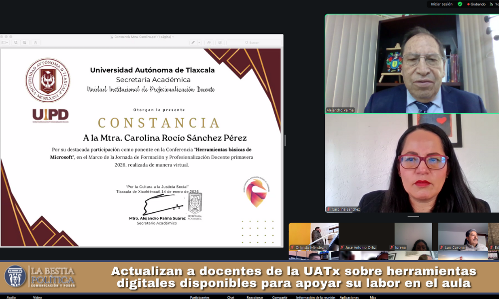 Para optimizar y potenciar el uso de las herramientas tecnológicas que ofrece la Universidad Autónoma de Tlaxcala (UATx) a su comunidad académica, la Maestra Carolina Rocío Sánchez Pérez, Jefa de Sistemas y Tecnologías de la Información de la Secretaría Técnica, impartió la conferencia 𝐇𝐞𝐫𝐫𝐚𝐦𝐢𝐞𝐧𝐭𝐚𝐬 𝐁𝐚́𝐬𝐢𝐜𝐚𝐬 𝐝𝐞 𝐌𝐢𝐜𝐫𝐨𝐬𝐨𝐟𝐭 𝟑𝟔𝟓, como parte de la Jornada de Formación y Profesionalización Docente Primavera 2026.