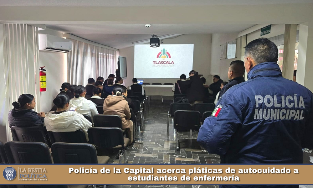 Elementos de la Dirección de Seguridad, Protección Ciudadana y Movilidad del Ayuntamiento de Tlaxcala reforzaron la estrategia de proximidad social al impartir una plática de autocuidado dirigida a estudiantes de la Escuela de Enfermería Florence Nightingale, ubicada en la Calle 2 de La Loma Xicohténcatl, como parte de las acciones preventivas y formativas que impulsa la administración municipal.