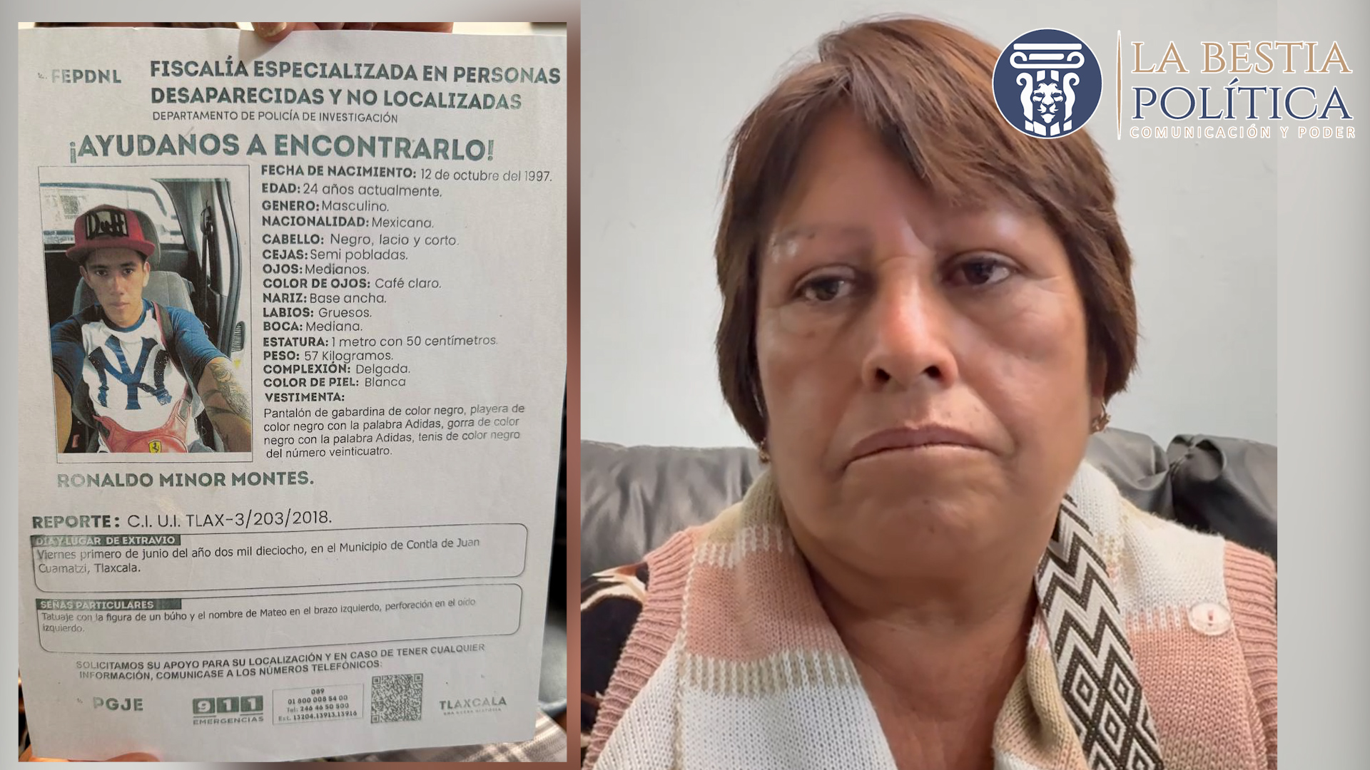 Mariana LOVERA// Desde el 1 de junio de 2018, Gloria María Montes Pérez vive con la incertidumbre y el dolor de no saber qué ocurrió con su hijo, Ronaldo Minor Montes, quien desapareció mientras realizaba actividades laborales en el municipio de Contla, Tlaxcala.