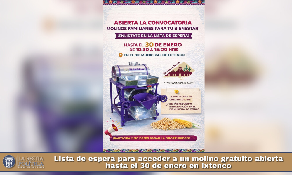 En coordinación con la Secretaría de Bienestar del Estado de Tlaxcala, el Gobierno Municipal de Ixtenco, encabezado por la presidenta municipal Aline Lazo Caballero, y el Sistema Municipal DIF, que preside Alicia Caballero Yonca, se informa a la población que se encuentra abierta la convocatoria para integrarse a la lista de espera del programa Molinos Familiares para tu Bienestar.