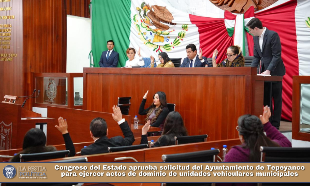 El Dictamen con Proyecto de Acuerdo por el que se autoriza al Ayuntamiento de Tepeyanco, Tlaxcala, a desincorporar y ejercer actos de dominio respecto de once unidades vehiculares del Patrimonio Municipal fue aprobado por unanimidad de votos. En consecuencia, se instruyó notificar su aprobación al propio Ayuntamiento y al titular del Órgano de Fiscalización Superior, así como su publicación en el Periódico Oficial del Gobierno del Estado.