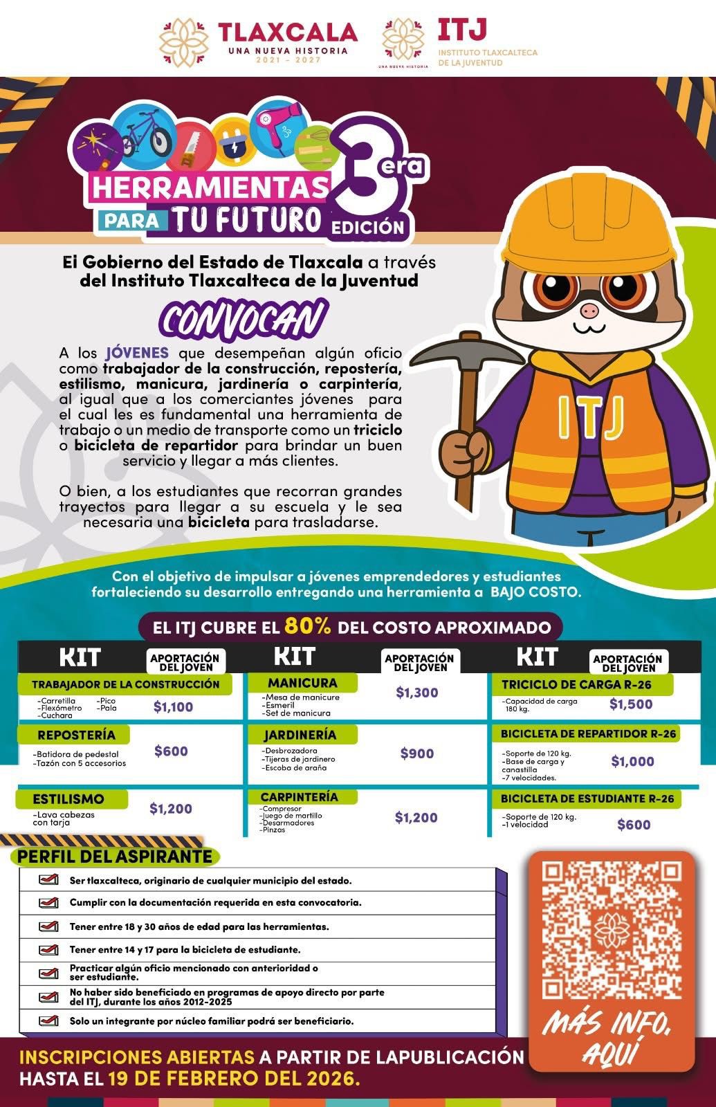 Huamantla, Tlaxcala.– Con el objetivo de impulsar el talento, el desarrollo productivo y la movilidad de las juventudes, el Instituto Tlaxcalteca de la Juventud (ITJ) lanzó la convocatoria “Herramientas para tu Futuro”, dirigida a jóvenes de Huamantla que se desempeñan en algún oficio o que actualmente son estudiantes.