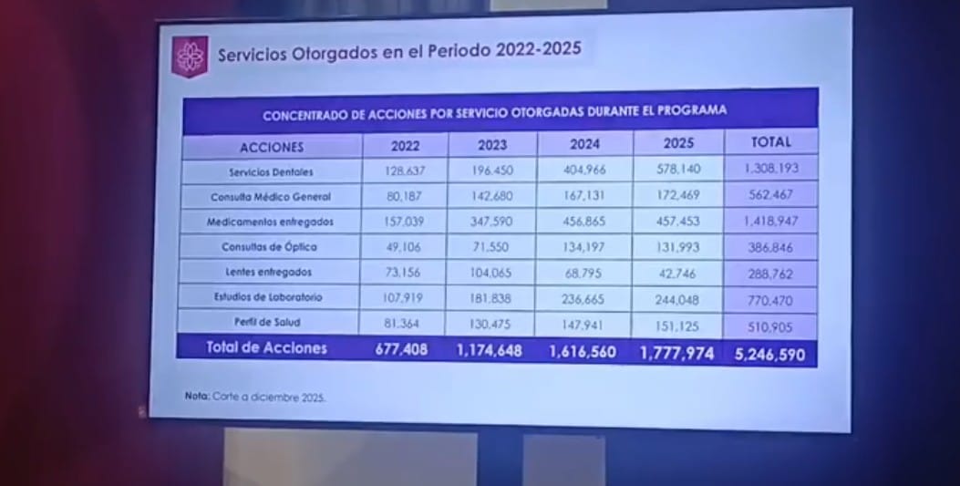 En suma del 2022 al 2025 se han brindado 5 millones 246 mil 590 servicios de salud de forma gratuita, el director de Análisis y Seguimiento, José Macías detalló que los programas de Salud y Nutrición concentran más del 75% del presupuesto de la secretaría, con inversiones anuales cercanas a los 125 y 120 millones de pesos, respectivamente.