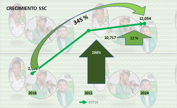 - Por ello es que el crecimiento de 2021 a 2024 pudiéramos describirlo como Fase de Maduración (2021-2024): El crecimiento cae al 12%. Siendo probablemente éste incremento, el techo operativo Santos Cedillo. Que más allá del crecimiento, lo importante es la consecución del objetivo, pues, por ejemplo, en ese año 2024, en Apizaco, el alcalde Pablo Badillo, incremento su votación en un margen del 60% pero no consiguió reelegirse, a diferencia de Juan Salvador Santos