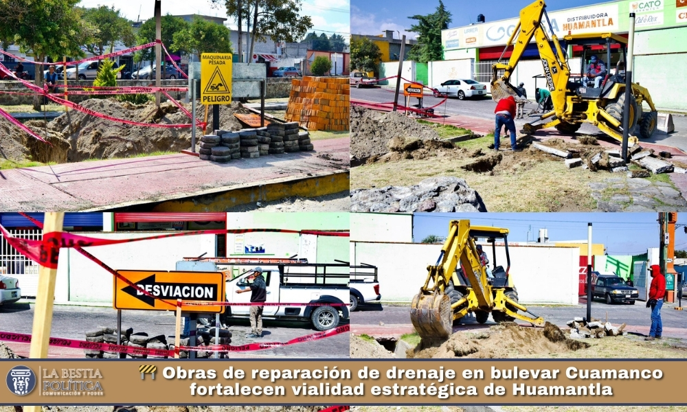 Con el objetivo de mantener en óptimas condiciones una de las vialidades más importantes del municipio, el Gobierno Municipal de Huamantla, a través de la Dirección de Obras Públicas, lleva a cabo trabajos de reparación del sistema de drenaje en el bulevar Cuamanco Poniente, una arteria fundamental para la movilidad diaria de la población.