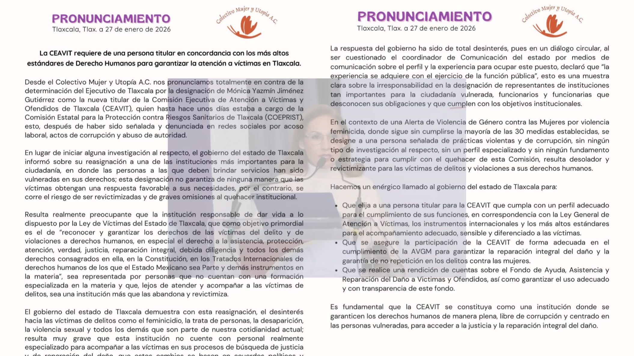 La organización advierte que colocar a una persona sin la formación y sensibilidad necesarias al frente de la comisión no solo la debilita institucionalmente, sino que “abre el riesgo de revictimización y omisiones graves”. Esta advertencia adquiere mayor relevancia dado el contexto de Tlaxcala, que mantiene activa una Alerta de Violencia de Género contra las Mujeres, con múltiples medidas aún pendientes de cumplimiento.