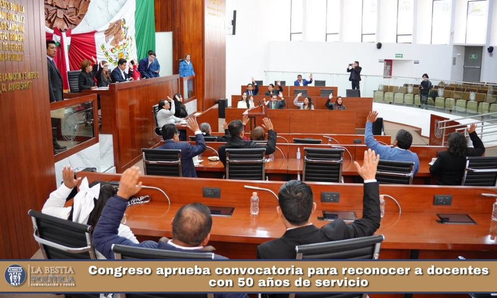 El Pleno de la LXV Legislatura del Congreso del Estado de Tlaxcala aprobó por unanimidad la convocatoria para otorgar el Reconocimiento, Estímulo Económico y la Presea “50 Años por la Educación al Servicio del Pueblo 2026”, dirigida a maestras y maestros con 50 años o más de servicio docente activo, como un acto de justicia y reconocimiento a su trayectoria profesional.