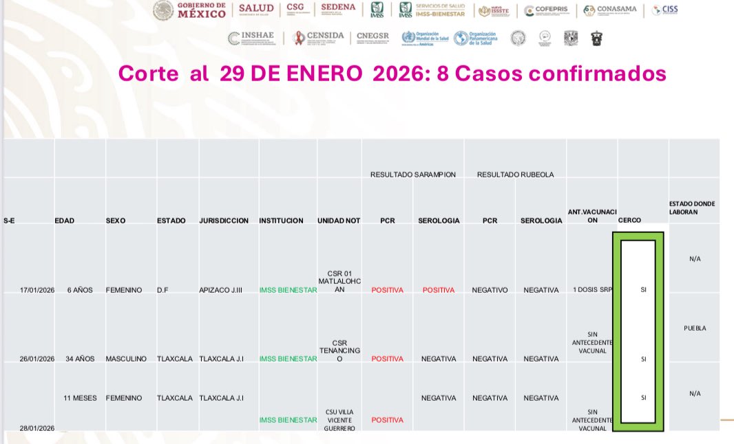 El secretario de Salud, Rigoberto Zamudio Meneses, informo que, al 29 de enero de 2026, se reporta un acumulado de ocho casos positivos de sarampión en la entidad, que corresponden a seis personas mayores de 18 años y dos menores de edad.
