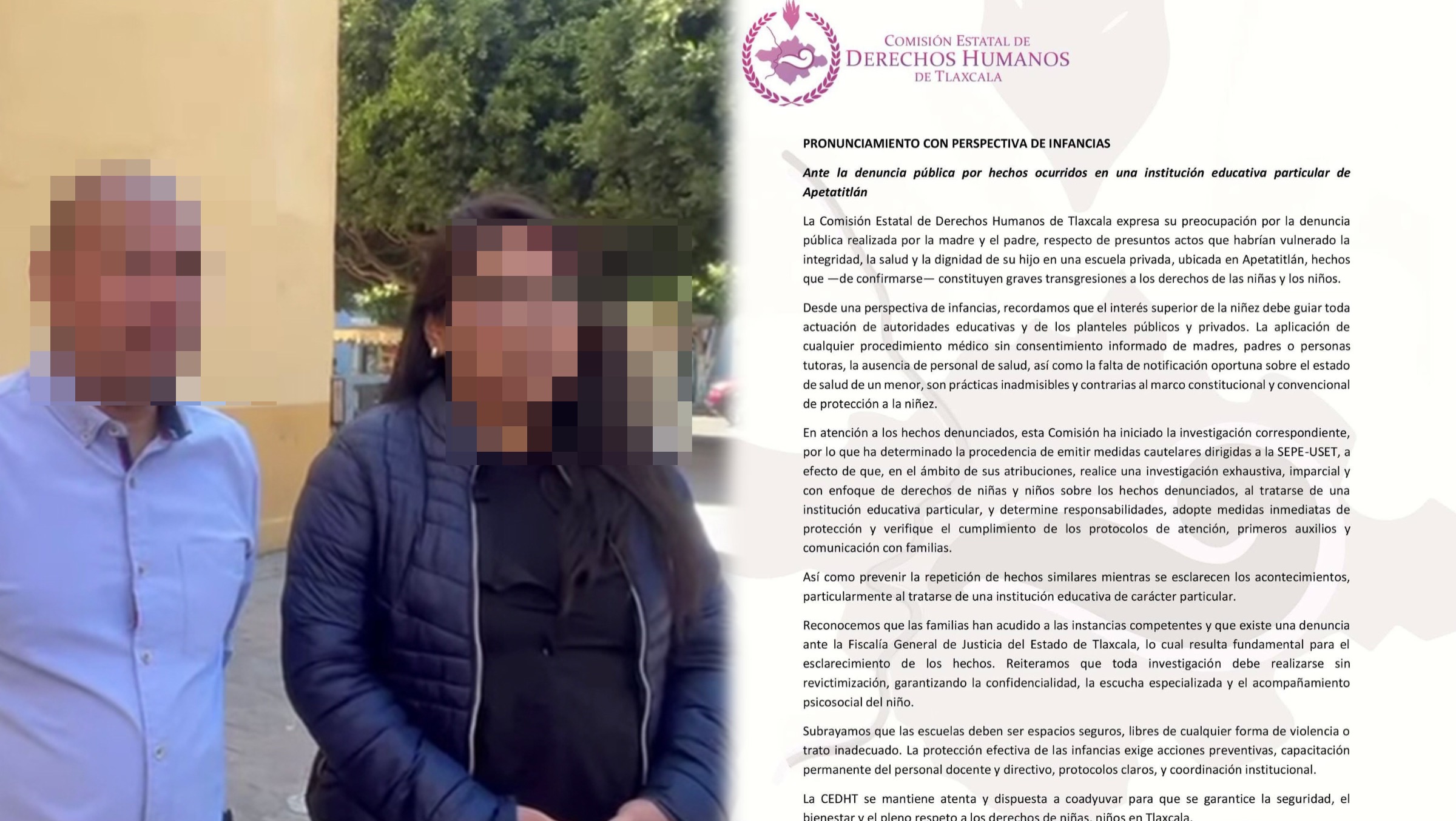 Ante la denuncia pública interpuesta por los padres de familia por presuntos actos que vulneraron la integridad, salud y dignidad de un menor en una institución educativa particular de Apetatitlán, la Comisión Estatal de Derechos Humanos de Tlaxcala (CEDHT) emitió un pronunciamiento y determinó medidas cautelares dirigidas a la SEPE-USET.