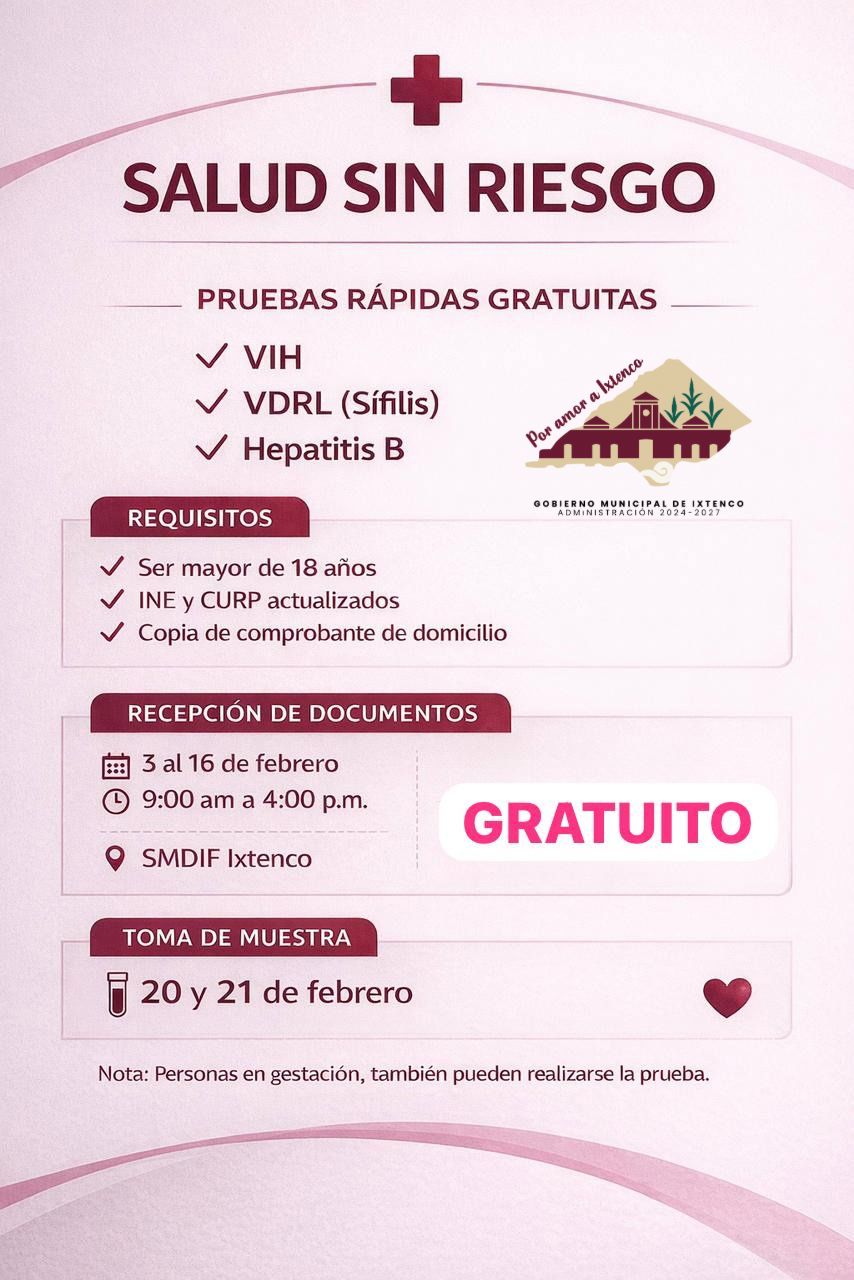 Ixtenco, Tlax.— Con el objetivo de fortalecer la prevención y el cuidado de la salud en el municipio, el Sistema Municipal DIF Ixtenco, en coordinación con el Gobierno Municipal, puso en marcha la campaña “Salud Sin Riesgo”, enfocada en la detección oportuna de enfermedades de transmisión sexual (ETS) mediante pruebas rápidas, confidenciales y seguras.