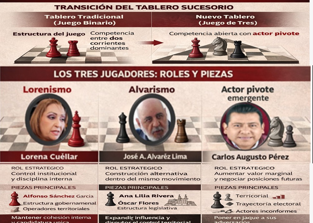 La decisión de separarse de su encargo público, indica que Pérez Hernández ha identificado que la circunstancia en estos momentos pesa más que las demás y por tanto, dará el paso a la disidencia, es decir, no se sumará a la cargada sistémica en favor de Sánchez García. No es la primera vez que el llamado caballo negro lee la coyuntura y se reposiciona. Tras su salida de la dirigencia estatal en 2024, lejos de diluirse, emprendió una gira territorial de promoción personal, que terminó obligando al propio gobierno a incorporarlo. Más tarde, ya desde FOMTLAX, utilizó el cargo como plataforma de expansión política sin renunciar a su proyecto propio. Hoy a diferencia de la dirigencia estatal, la salida es por decisión propia y lo potencializa como un disidente. Esto es suficiente para cimbrar el tablero del lorenismo, pues como en todo sistema, hay actores conformes y por tanto leales, inconformes pero resignados, inconformes y propensos a mejorar. Por lo que varios de esos actores, están atentos a la nueva carrera que se desarrolla, porque la confirmación del caballo negro en el tablero, amplía el campo de batalla actual; recuerde usted apreciable lector lectora, que el proceso sucesorio no se define del campo del lorenismo, (corriente interna de morena Tlaxcala, comandada por la gobernadora Lorena Cuéllar). El lorenismo es solo un lado del tablero, enfrente, está Álvarez Lima con sus fichas, la senadora Ana Lilia Rivera y reina de sus piezas y su alfil, Óscar Flores, Tesorero del gobierno del Estado de México. Piezas que el Alvarismo, mueve coordinadamente en búsqueda del jaque mate; Bajo esta nueva dinámica, las declinaciones previamente realizadas pierden sentido táctico, pues fueron diseñadas para fortalecer una candidatura única dentro de un juego cerrado que ya no existe como tal.