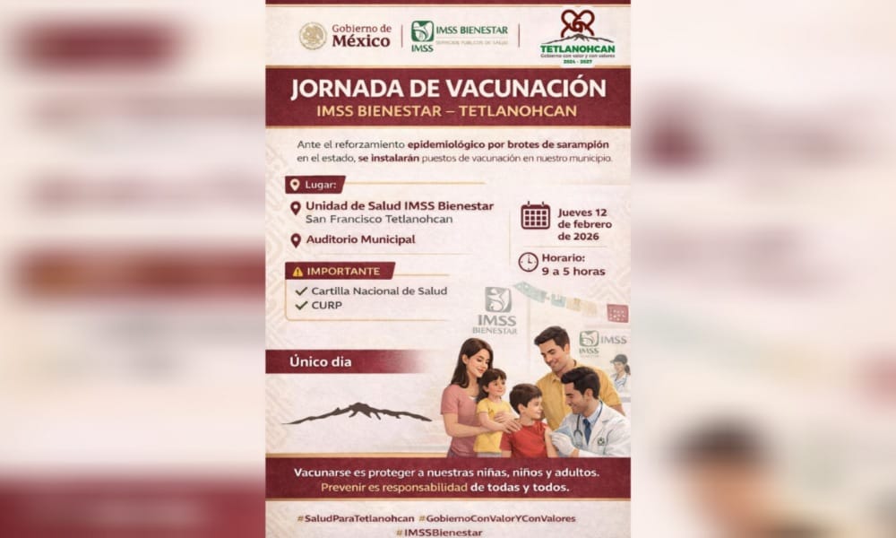 Como parte del reforzamiento epidemiológico ante brotes de sarampión registrados en el estado, IMSS Bienestar realizará una jornada de vacunación en coordinación con el Gobierno Municipal de Tetlanohcan, el día de mañana, jueves 12 de febrero de 2026, en un horario de 9:00 a.m. a 5:00 p.m.
