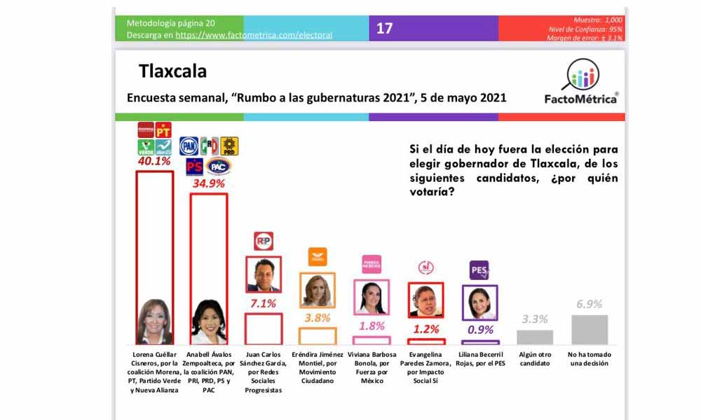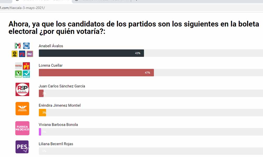 Por ejemplo Destino 21 señala en su más reciente encuesta del pasado tres de mayo del 2021 que la candidata de «Juntos Haremos Historia» Lorena Cuéllar un porcentaje del 47 por ciento, por 43 por ciento de la de «Unidos por Tlaxcala», Anabell Ávalos.
