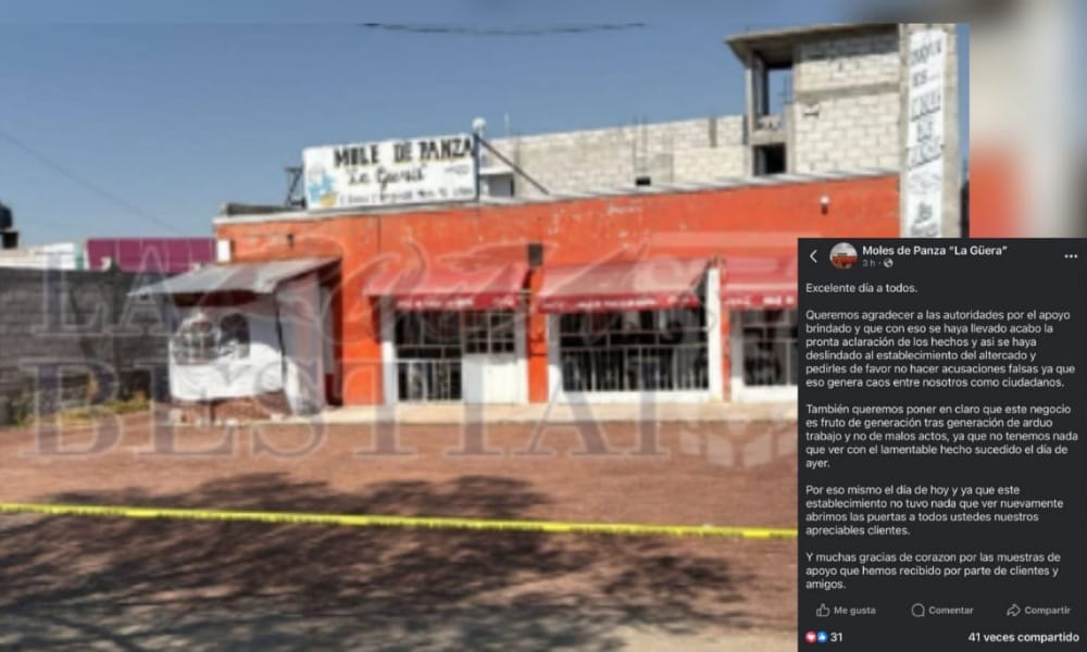 Mariana LOVERA// Luego del ataque armado registrado la tarde del jueves 12 de febrero en el restaurante “Mole de Panza La Güera”, ubicado sobre la carretera Huamantla–Apizaco, los propietarios del establecimiento emitieron un comunicado para deslindarse de los hechos y agradecer el apoyo de las autoridades y la clientela.