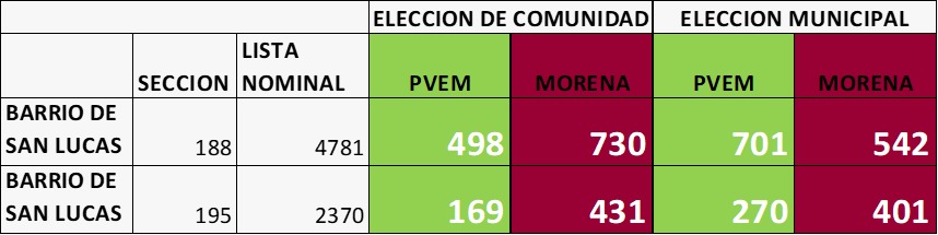 Reproduzca esta operación en San Sebastián, donde Salvador Santos obtuvo 1875 vs 1619 de morena, mientras que la comunidad la ganó MC con 834 votos y en segundo el de morena con 829 votos. O en la sección electoral 178, correspondiente a Zapata, donde el primer lugar de comunidad, lo obtuvo morena y el de presidencia municipal el partido verde, ambos rozando los 650 votos