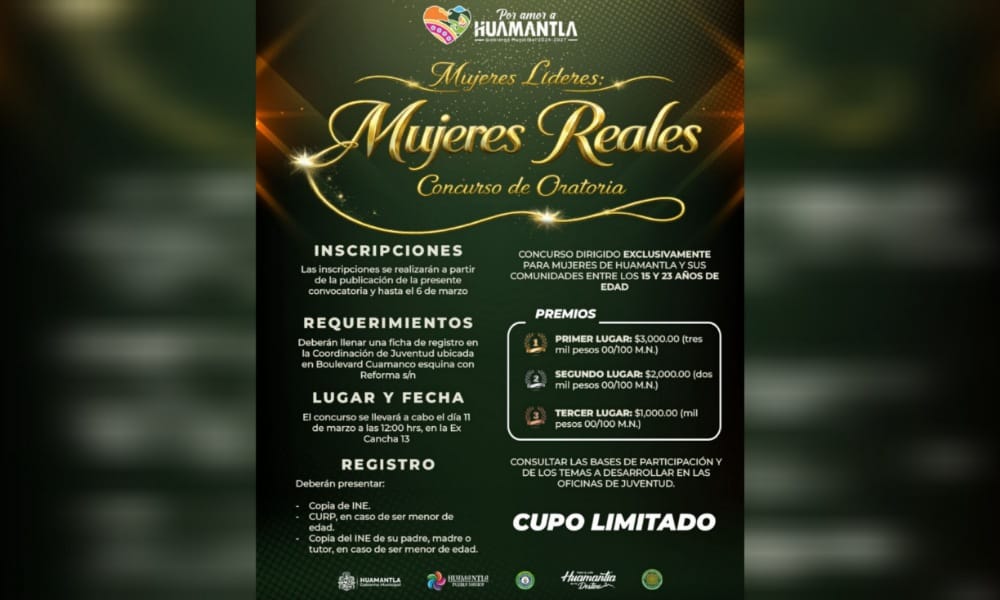 Con el objetivo de impulsar la participación, el liderazgo y la expresión de las jóvenes huamantlecas, el Gobierno Municipal de Huamantla, a través de la Coordinación de Juventud, invita a participar en la convocatoria para el concurso de oratoria “Mujeres Líderes: Mujeres Reales”, dirigido a mujeres del municipio y sus comunidades.
