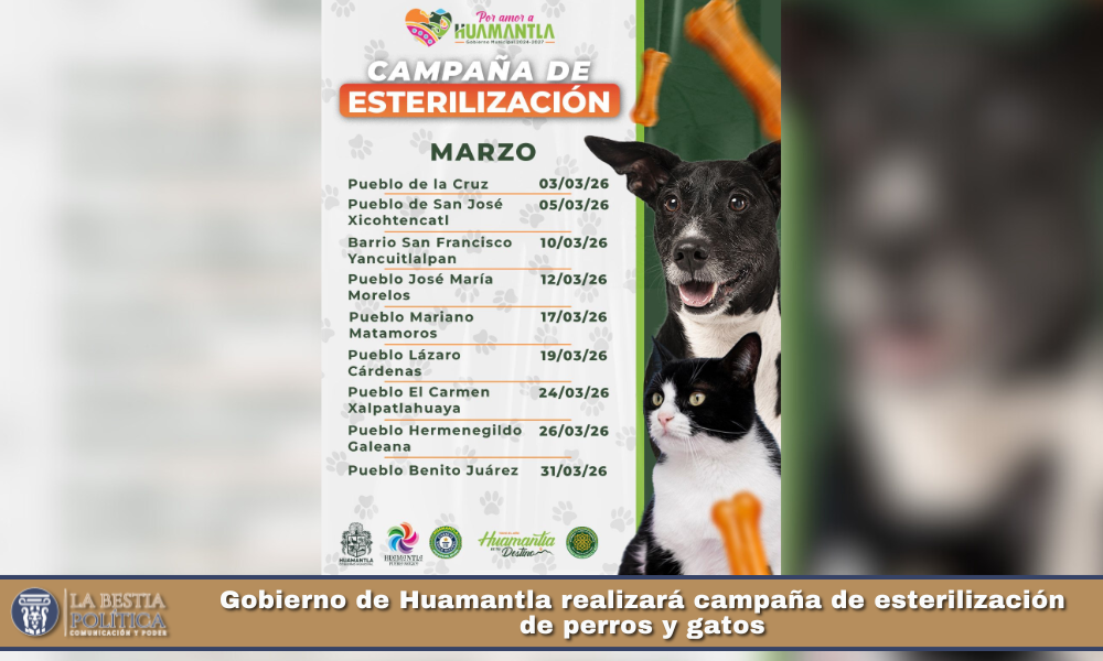 El Ayuntamiento de Huamantla, que presiden Salvador Santos Cedillo, anunció el lanzamiento de una intensa Campaña de Esterilización de Perros y Gatos, que busca promover el bienestar animal y controlar la sobrepoblación de mascotas, que se llevará a cabo del 03 al 31 de marzo en diferentes comunidades del municipio.