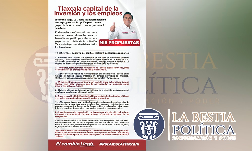 10.- Vamos a crear fuentes de empleo con la unidad de las y los empresarios. Eso va a representar uno de los cambios que el pueblo demanda. Ocupación y empleo. De nuestra parte las obras municipales van a llevar el sello de Amor a Tlaxcala.