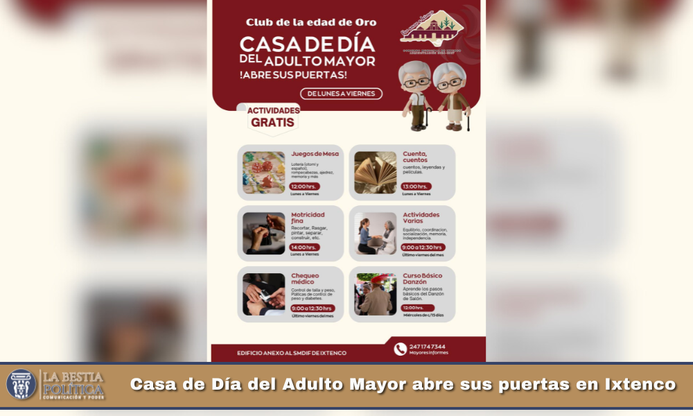 Con el objetivo de promover el bienestar, la convivencia y la salud de las personas adultas mayores del municipio, el Gobierno Municipal de Ixtenco puso en marcha la Casa de Día del Adulto Mayor “Club de la Edad de Oro”, un espacio diseñado para ofrecer actividades recreativas, culturales y de atención integral.
