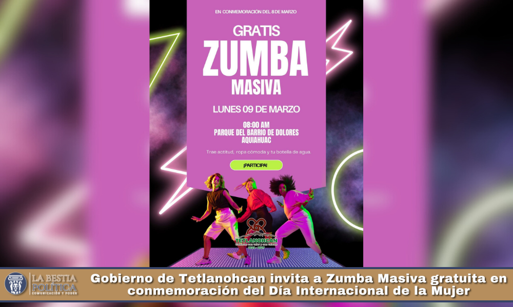 En el marco de la conmemoración del Día Internacional de la Mujer, el Gobierno Municipal de Tetlanohcan invita a la ciudadanía a participar en una Zumba Masiva gratuita, que se llevará a cabo el próximo lunes 9 de marzo a las 08:00 horas, en el parque del barrio de Dolores, Aquiahuac.