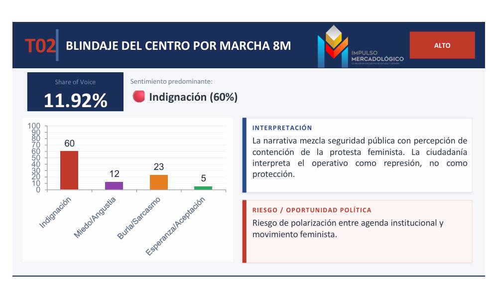 En segundo plano, la conversación digital estuvo fuertemente marcada por el Día Internacional de la Mujer. El blindaje del centro de Tlaxcala por la marcha del 8M generó el 11.92% de las menciones y un sentimiento predominantemente de indignación, ya que parte de la ciudadanía interpretó el operativo como un intento de contención de la protesta más que como una medida de seguridad.