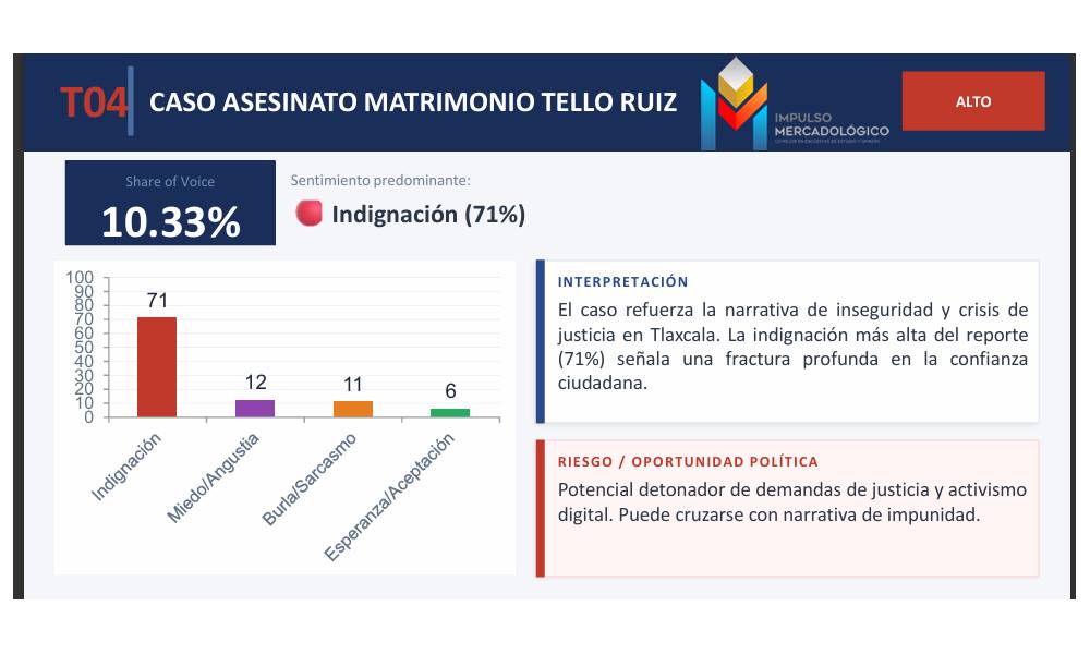 Otro tema que generó fuerte reacción fue el asesinato del matrimonio Tello Ruiz, que concentró el 10.33% de la conversación digital, con un nivel de indignación que alcanzó el 71%, el más alto del reporte. El caso reforzó la percepción de inseguridad y crisis de justicia en la entidad.