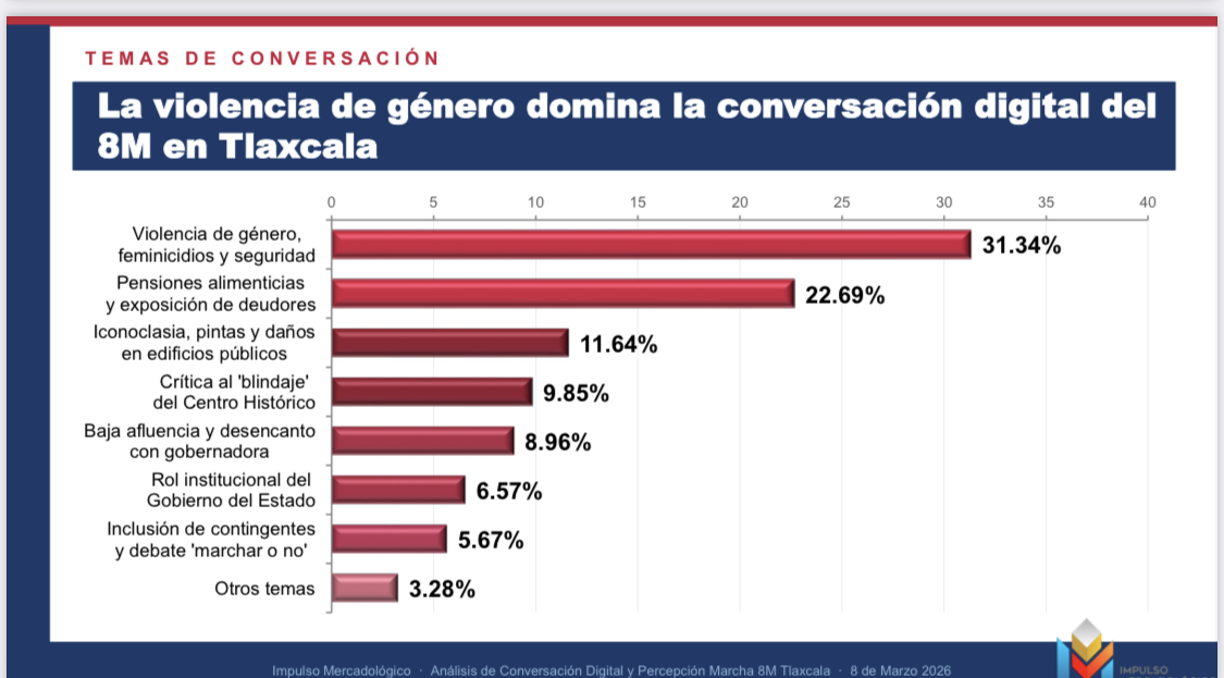 De acuerdo con el estudio «Escucha Digital 8M Tlaxcala 2026», realizado por Impulso Mercadológico, durante el 8 y 9 de marzo se registraron tres picos de actividad digital: el desarrollo de la marcha (14:00-18:00), los actos de iconoclasia y reacciones virales (18:00-23:00), y el análisis post-evento en Facebook e Instagram (8:00-10:00 del 9 de marzo).