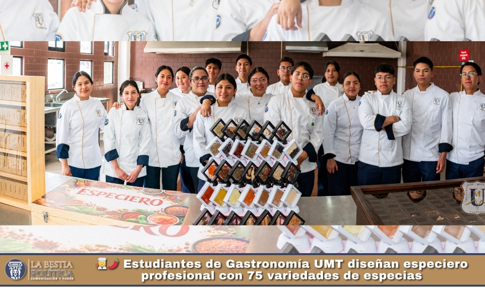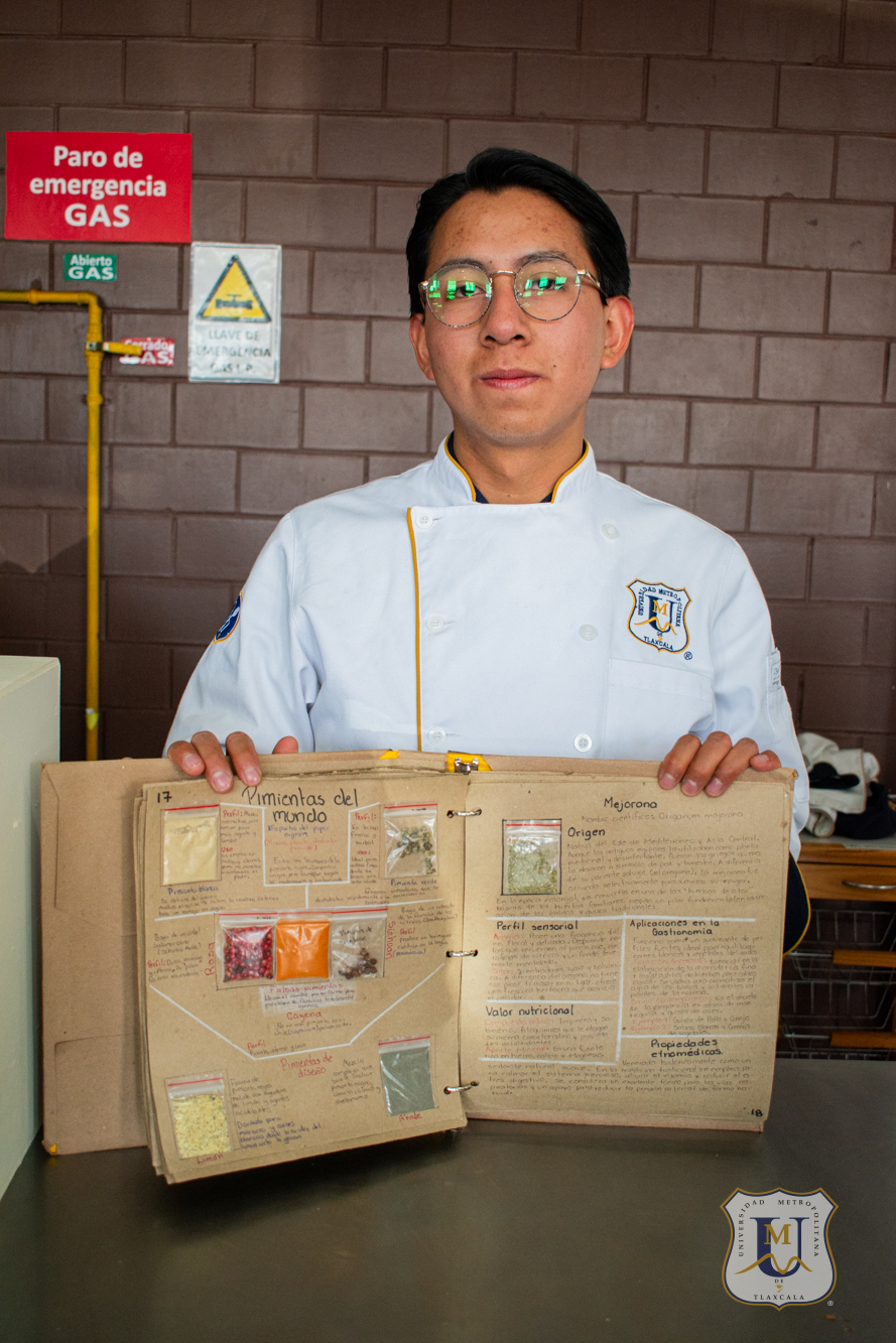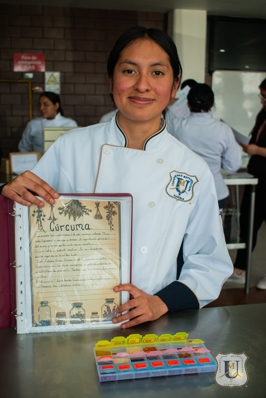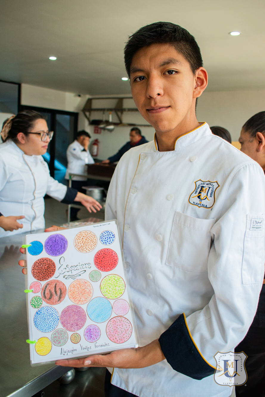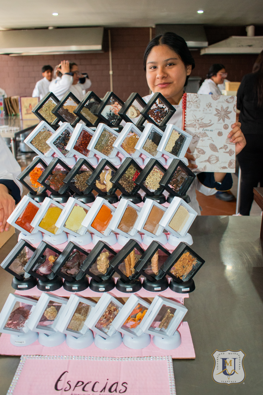 Alumnos de segundo cuatrimestre de la Licenciatura en Gastronomía de la Universidad Metropolitana de Tlaxcala desarrollaron un especiero profesional con una colección de 75 variedades de especias, como parte de la asignatura “Identificación de Productos”.