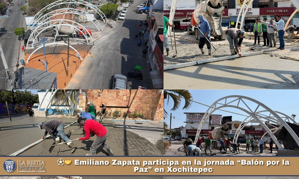 El presidente municipal de Emiliano Zapata, Santos Tavarez García, supervisó los avances de la velaria que se construye en la Plaza de la Cultura de la colonia Prohogar, una obra que busca mejorar los espacios públicos del municipio.