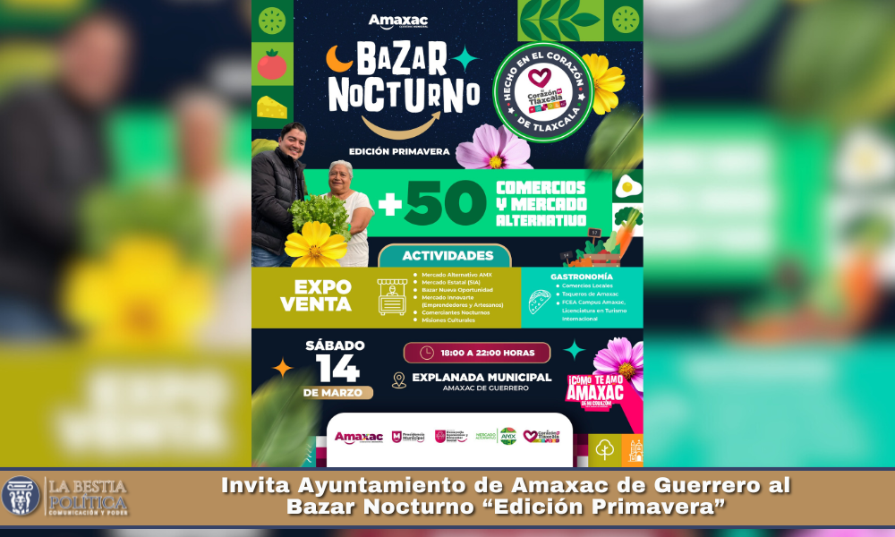 El Ayuntamiento de Amaxac de Guerrero, que preside el alcalde Mauricio Pozos Castañón, extiende una cordial invitación a la ciudadanía y a visitantes para asistir al Bazar Nocturno “Edición Primavera”.