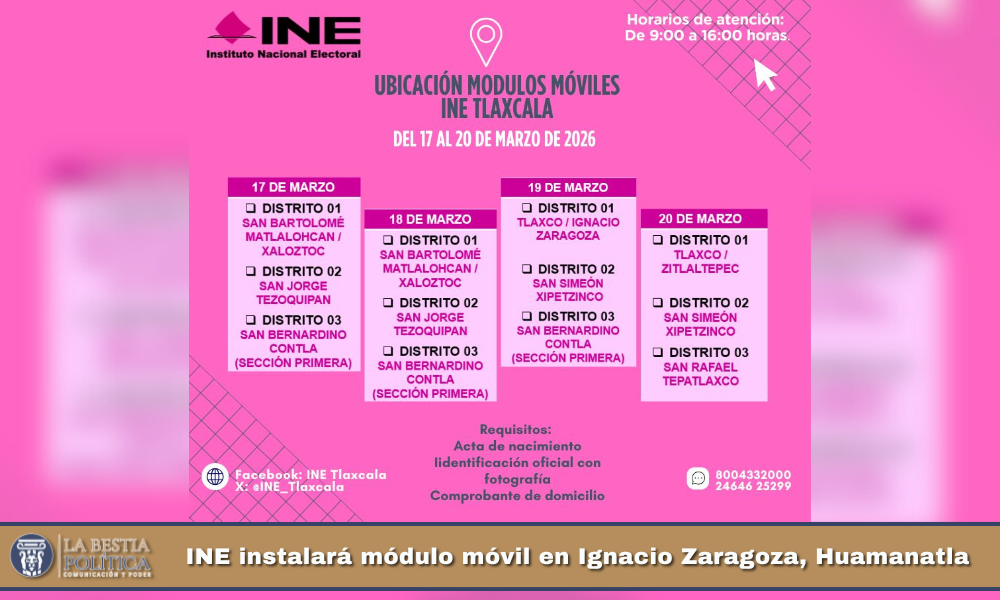 Esta jornada se llevará a cabo el próximo 19 de marzo en un horario de 9:00 a 16:00 horas, como parte de las acciones que impulsa el INE en Tlaxcala para acercar sus servicios a la población. En esta ocasión, Ignacio Zaragoza, Huamantla, será la única localidad del municipio que recibirá este módulo itinerante.