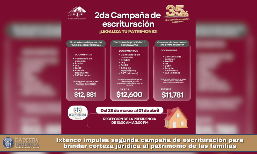 Con el objetivo de brindar certeza jurídica al patrimonio de las familias del municipio, el Gobierno Municipal de Ixtenco anunció la apertura de la segunda campaña de escrituración, un programa que permitirá a las y los ciudadanos regularizar la situación legal de sus propiedades con un subsidio del 35 por ciento en gastos notariales.