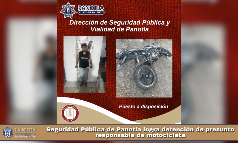La Dirección de Seguridad Pública y Vialidad del municipio de Panotla informa que, derivado de los recorridos preventivos que se realizan de manera permanente para inhibir actos delictivos, se logró la detención de un masculino identificado como Iván N., de 40 años de edad, quien presuntamente habría robado una motocicleta marca Vento en la comunidad de San Jorge Tezoquipan.