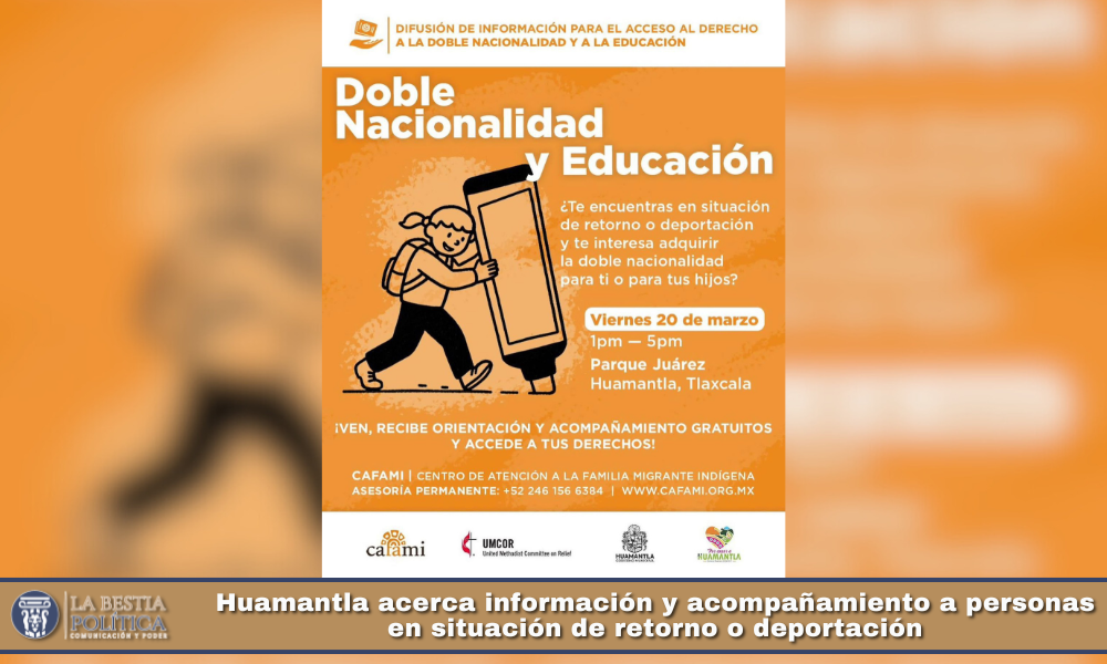 Con el objetivo de brindar apoyo y orientación a personas en situación de retorno o deportación, el Gobierno Municipal de Huamantla, en coordinación con CAFAMI, invita a la ciudadanía a participar en la jornada de información sobre doble nacionalidad y acceso a la educación.