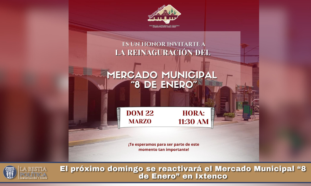 El Gobierno Municipal de Ixtenco informa que el próximo domingo 22 de marzo a las 11:30 horas se llevará a cabo la reinauguración del Mercado Municipal “8 de Enero”, un espacio que será reactivado para fortalecer la economía local y ofrecer a la ciudadanía instalaciones dignas, limpias y funcionales.