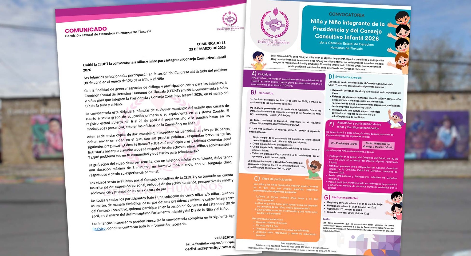 Con la finalidad de generar espacios de diálogo y participación con y para las infancias, la Comisión Estatal de Derechos Humanos de Tlaxcala (CEDHT) emitió la convocatoria a niñas y niños para que integren la Presidencia y Consejo Consultivo Infantil 2026, en el marco del Día de la Niña y el Niño.