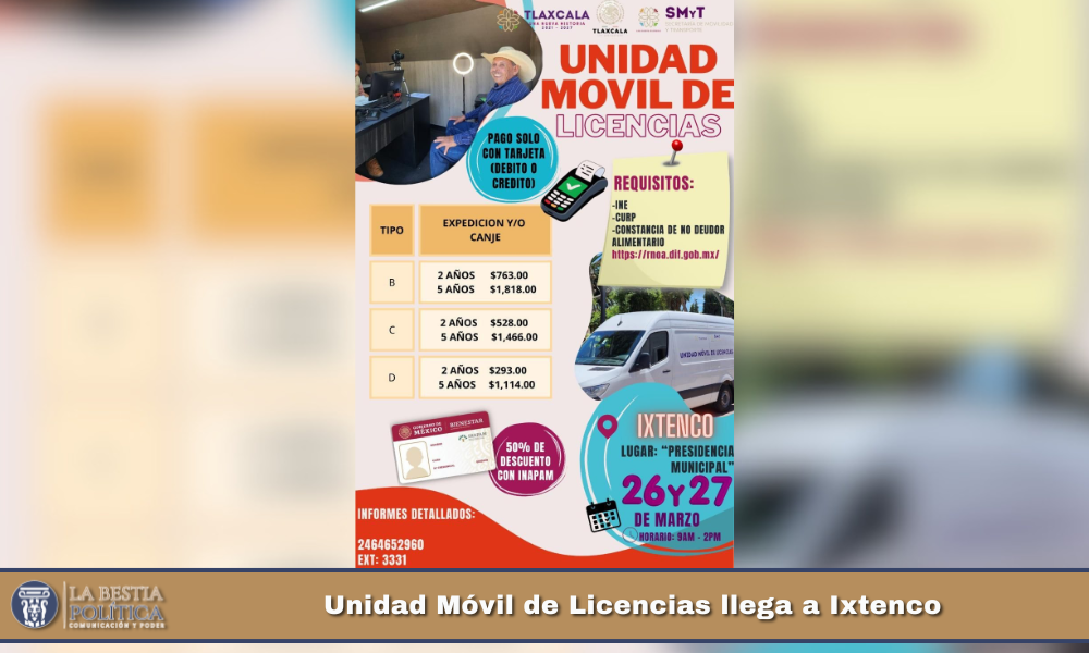 El Gobierno Municipal de Ixtenco, encabezado por la presidenta municipal Aline Lazo Caballero, en coordinación con el Gobierno del Estado de Tlaxcala a través de la Secretaría de Movilidad y Transporte, acerca a la ciudadanía el servicio de la Unidad Móvil de Licencias, con el objetivo de facilitar la realización de trámites de manera ágil y sin necesidad de salir del municipio.