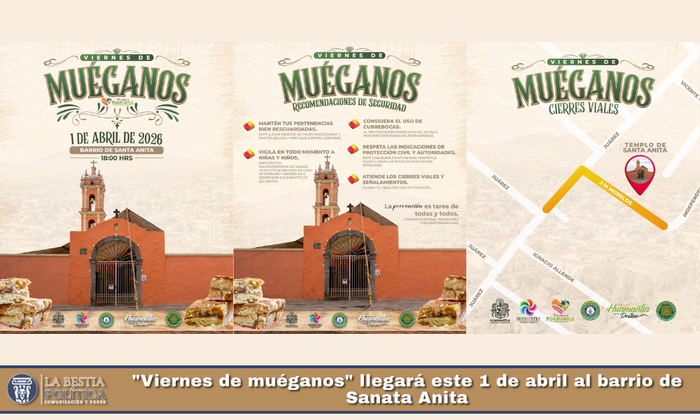 El Gobierno Municipal de Huamantla que encabeza Salvador Santos Cedillo invita a la ciudadanía a disfrutar del “Viernes de Muéganos”, que en esta ocasión se realizará de manera extraordinaria el próximo miércoles 1 de abril en el barrio de Santa Anita, como parte de las actividades que preservan y promueven las tradiciones del municipio.