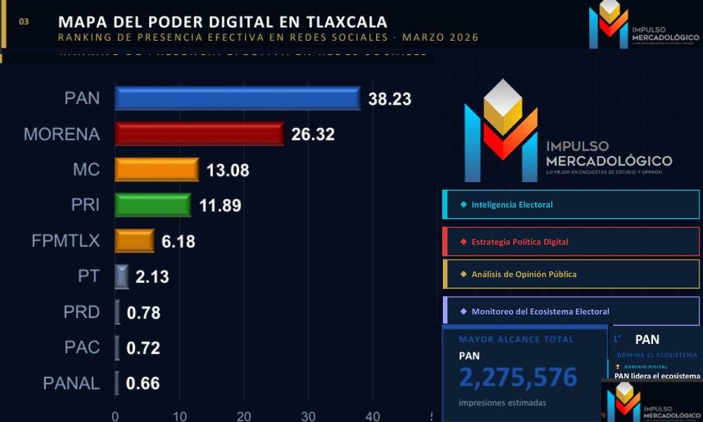 El Partido Acción Nacional (PAN) se mantiene como la principal fuerza en el ecosistema digital político de Tlaxcala, al conservar el mayor nivel de alcance y presencia en redes sociales durante marzo de 2026.
