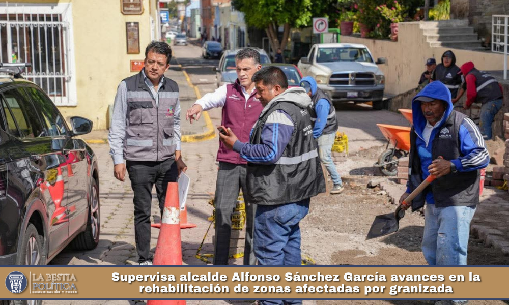 El presidente municipal, Alfonso Sánchez García, encabezó la mañana de este lunes un recorrido de supervisión en zonas afectadas por la granizada del pasado fin de semana y constató los avances en la rehabilitación de zonas afectadas, como parte de las acciones de su gobierno que escucha y resuelve.