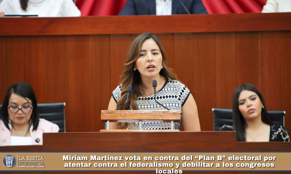 La diputada local del Partido Acción Nacional (PAN), Miriam Esmeralda Martínez Sánchez votó en contra de la minuta de reforma electoral del llamado Plan B al advertir que dicha propuesta representa una medida centralista que debilita el federalismo y compromete la autonomía de las entidades federativas.