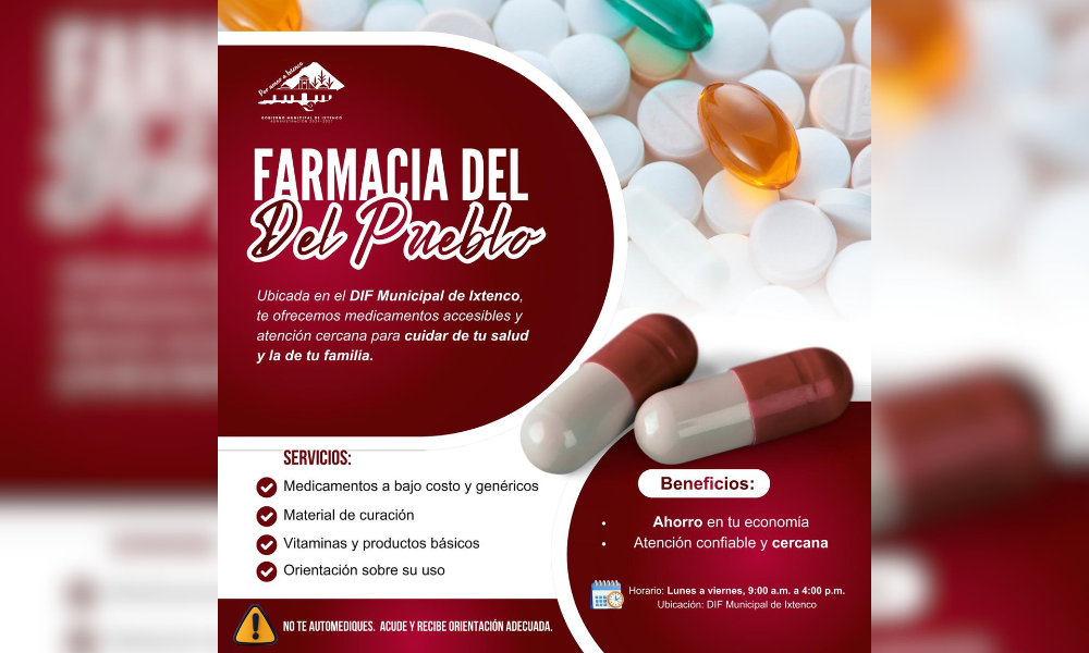 La Farmacia del Pueblo atiende de lunes a viernes en un horario de 9:00 a.m. a 4:00 p.m. en las instalaciones del DIF Municipal de Ixtenco.