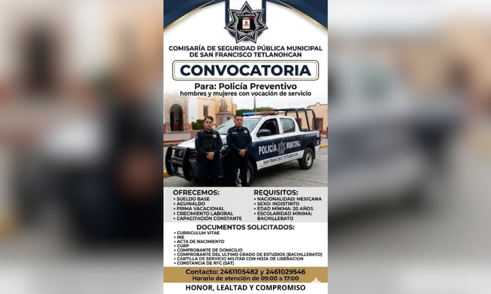 Con el objetivo de fortalecer la seguridad y continuar brindando un servicio cercano a la ciudadanía, la Comisaría de Seguridad Pública Municipal de San Francisco Tetlanohcan lanzó la convocatoria para integrar a nuevos elementos a la Policía Preventiva.