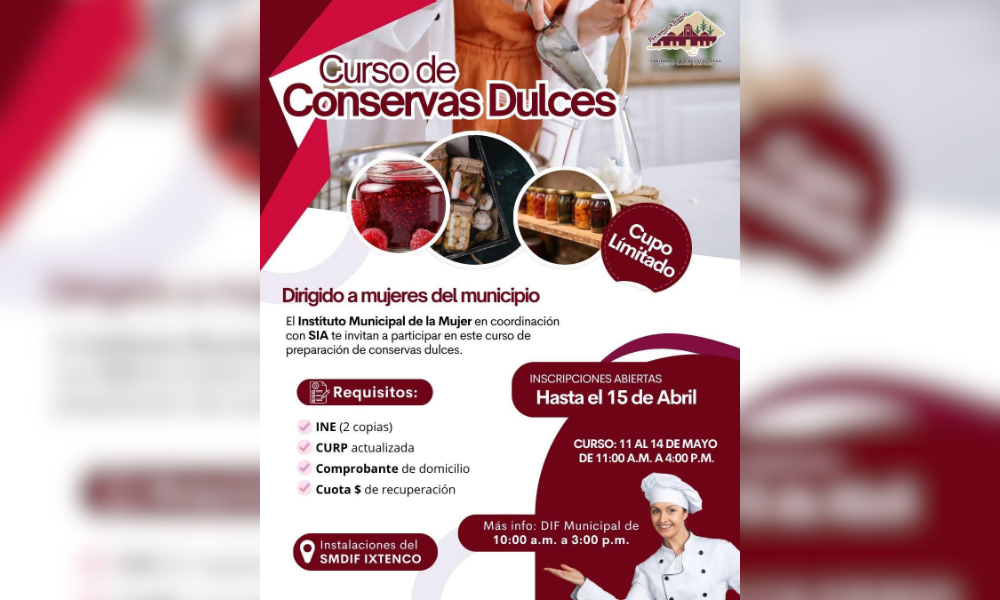 El Gobierno Municipal de Ixtenco hace un llamado a las mujeres del municipio a aprovechar los últimos días de inscripción al Curso de Conservas Dulces, impulsado por el Instituto Municipal de la Mujer en coordinación con SIA.